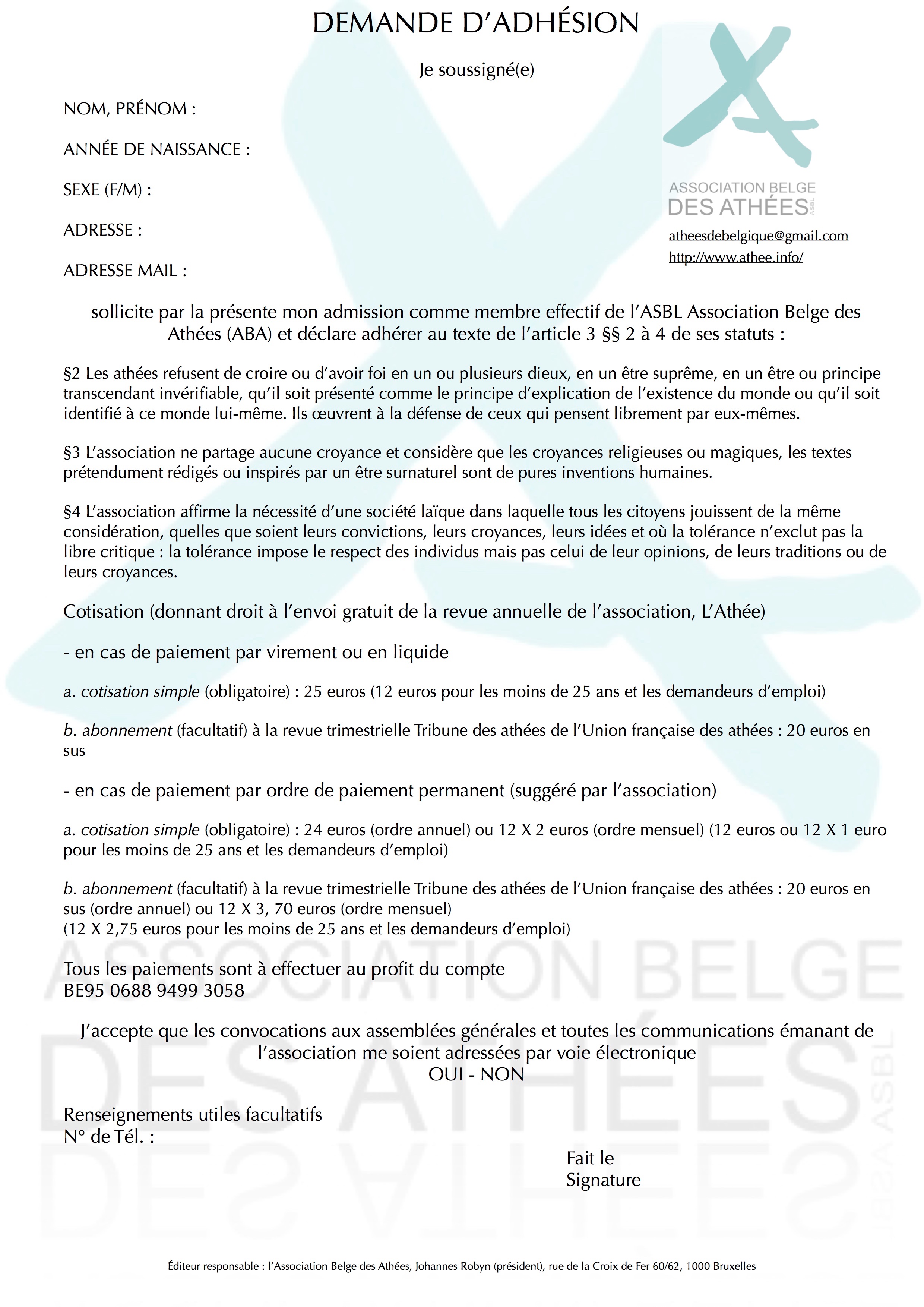 Tous les paiements sont à effectuer au profit de l’Association Belge des Athées sur le compte : BE95 0688 9499 3058
