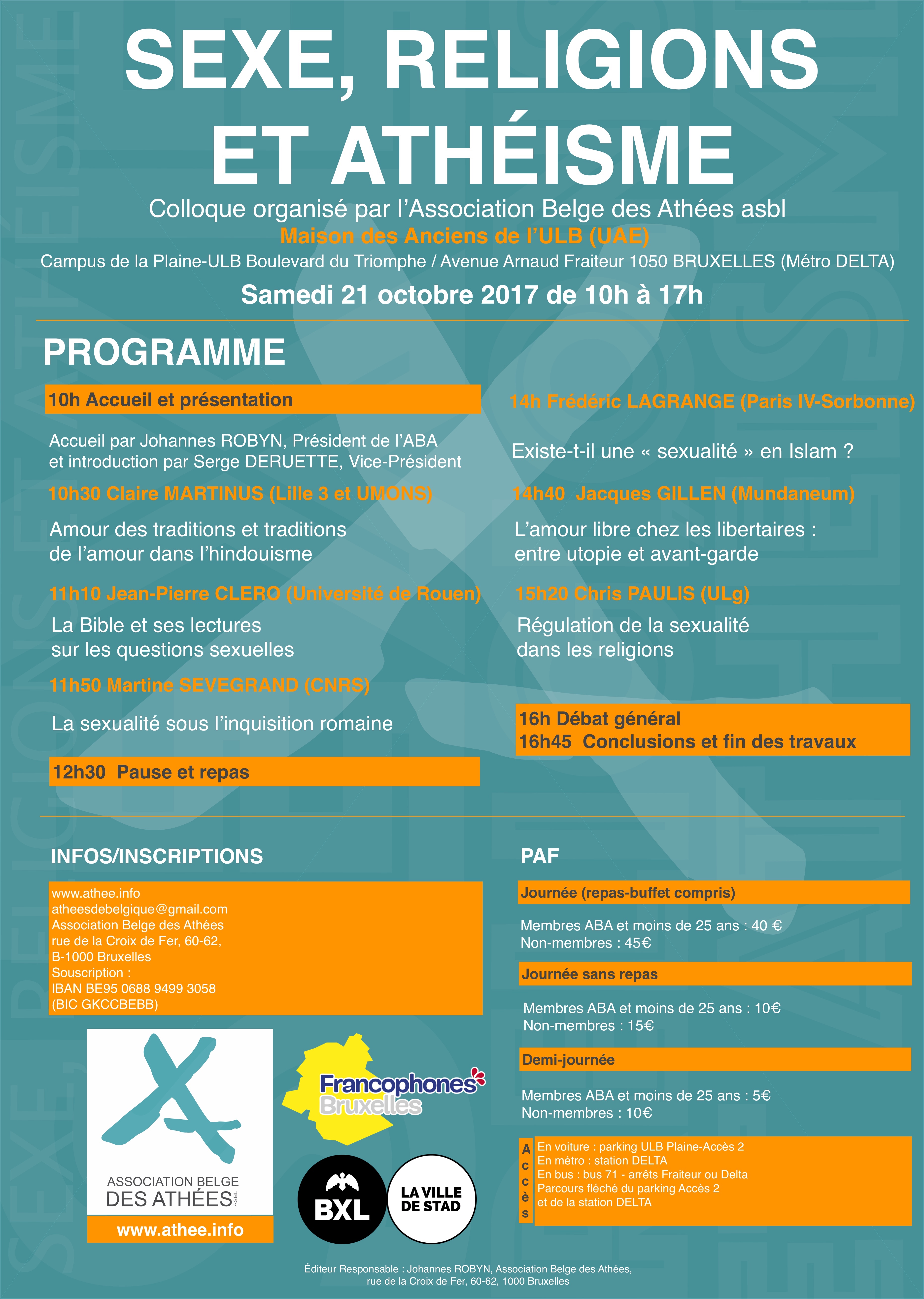 L’association Belge des Athées (ABA) a le plaisir de vous présenter, le 21 octobre, son colloque 2017
