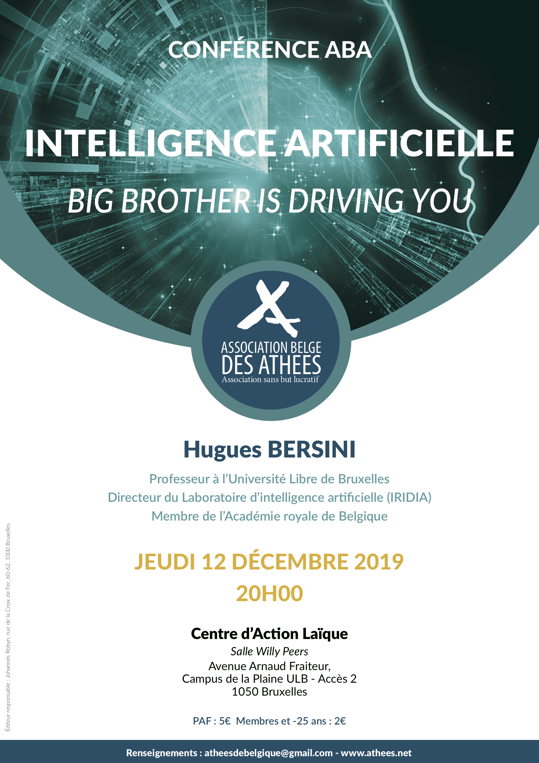 L’Association Belge des athées organise (2019-2020) un cycle de conférences consacré au libre arbitre dans différents domaines comme les sciences cognitives, l’Intelligence Artificielle, le conflit habitus/libre arbitre en sociologie, … La première conférence portera sur l’Intelligence Artificielle.