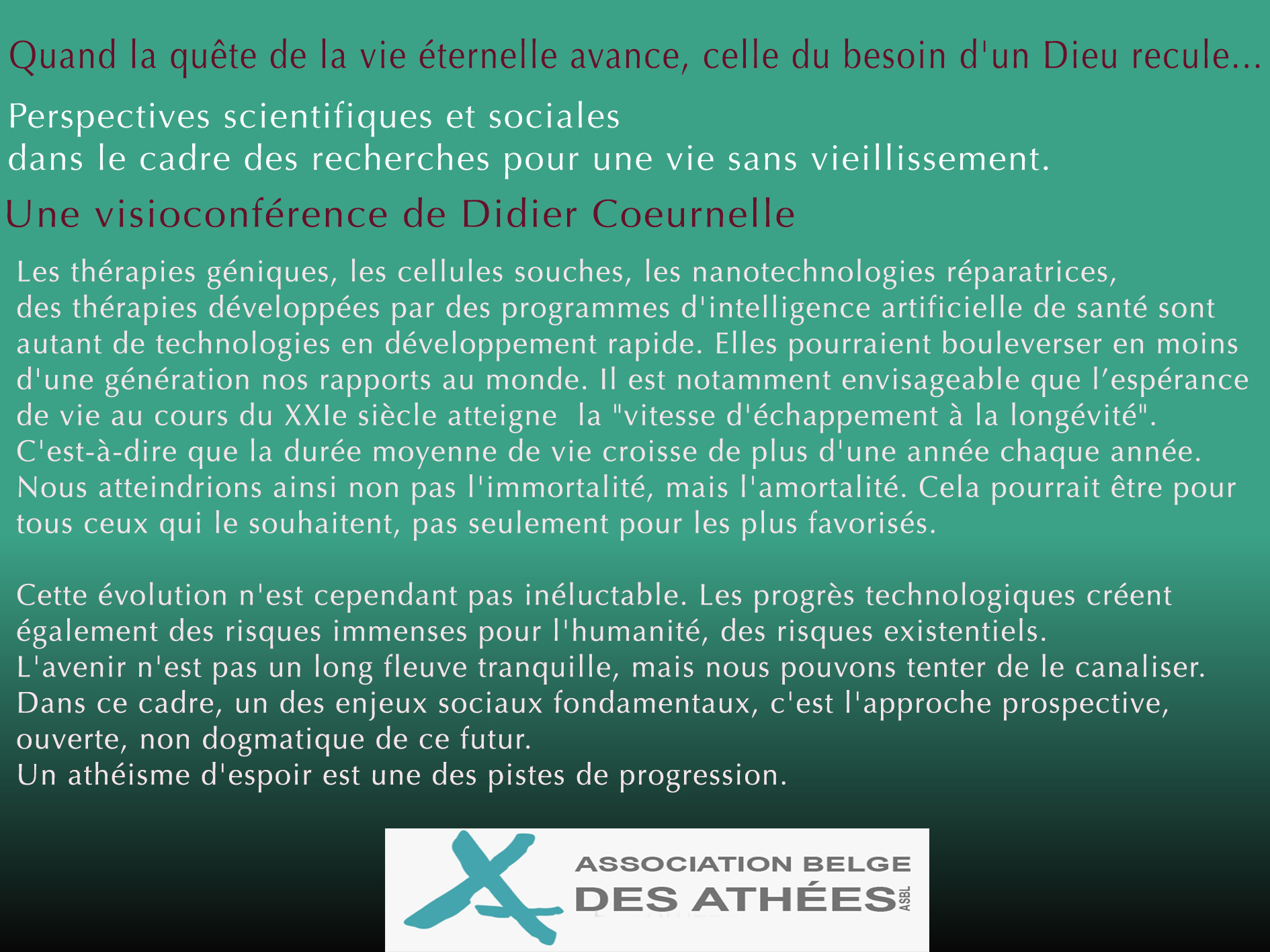 « Quand la quête de la vie éternelle avance, celle du besoin d’un Dieu recule… » visioconférence de Didier Coeurnelle le 25 mars à 20h en direct sur notre site