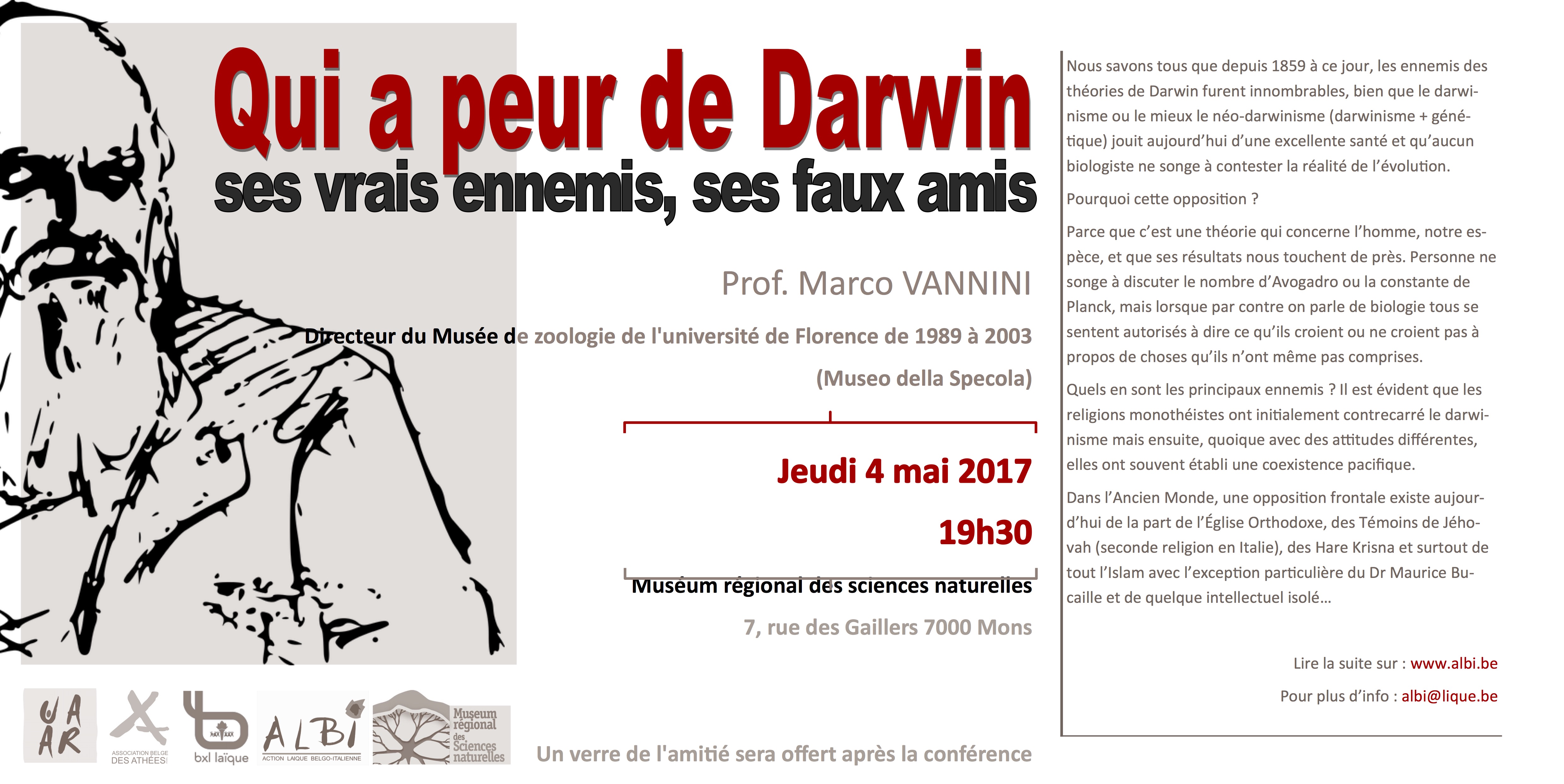 JF 10 avril 2017 QUI A PEUR DE DARWIN, ses vrais ennemis, ses faux amis… Conférence co-organisée par l’Association Belge des Athées… A ne pas manquer ! Télécharger le flyers en format PDF Darwin 2