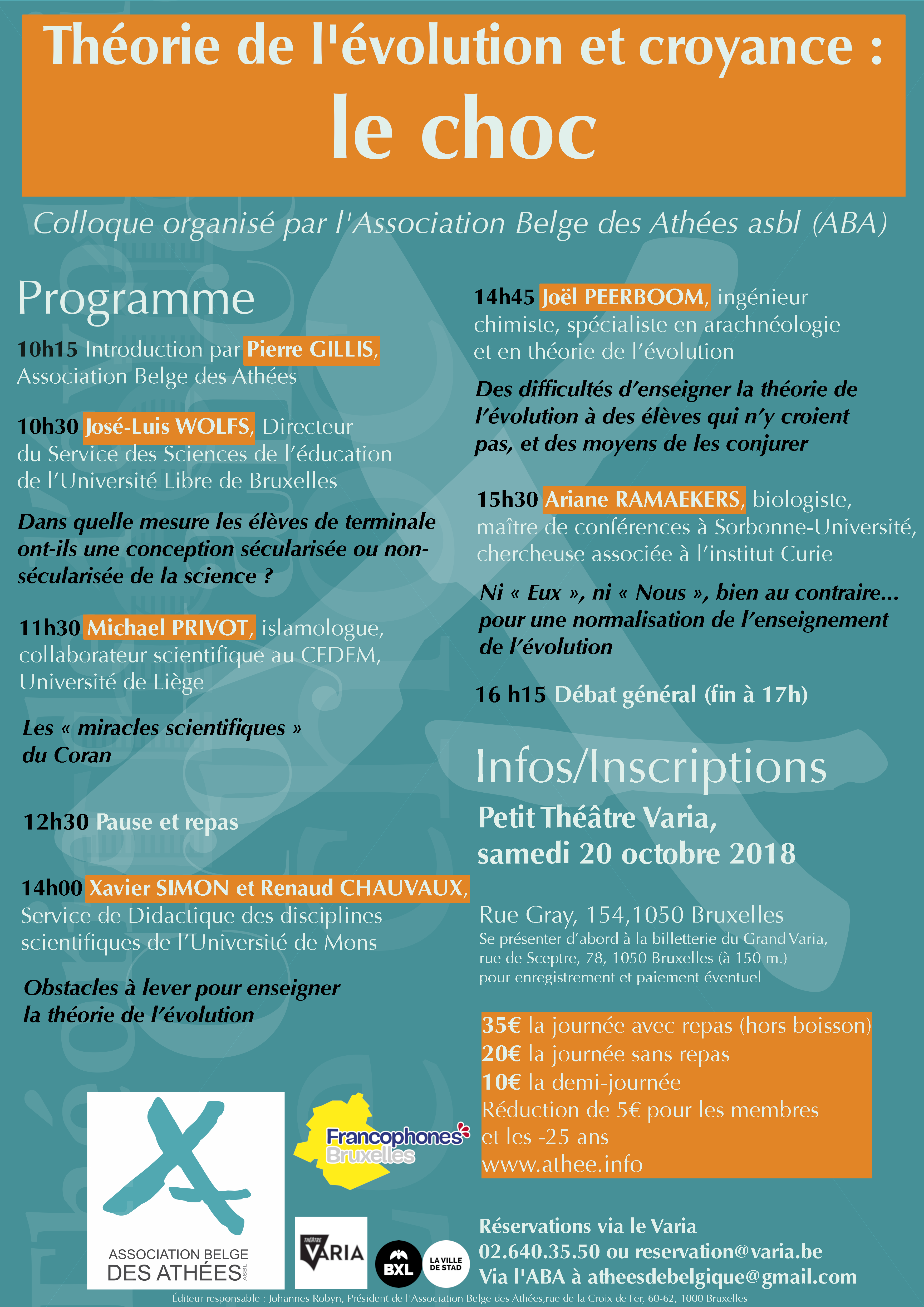 Ce samedi 20 octobre, au petit Varia à Bruxelles, nous avons plaisir de vous présenter notre désormais célèbre colloque annuel. Cette année, on vous parlera de « théorie de l’évolution et croyance : le choc » !